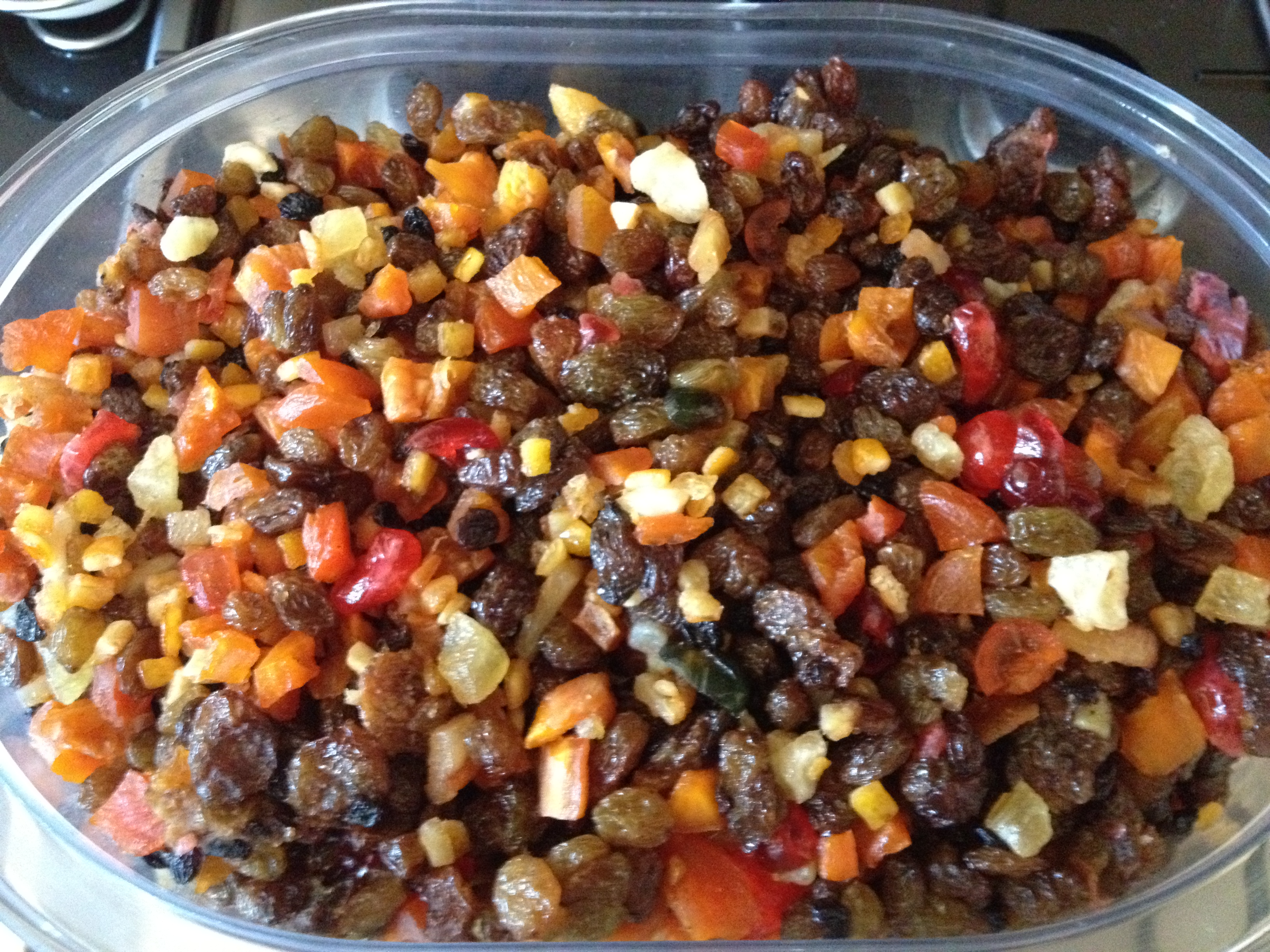 1.25 kg combination of dried: apricots, peaches, pineapple, pears; glacé fruit & mixed peel (2lbs 8oz)