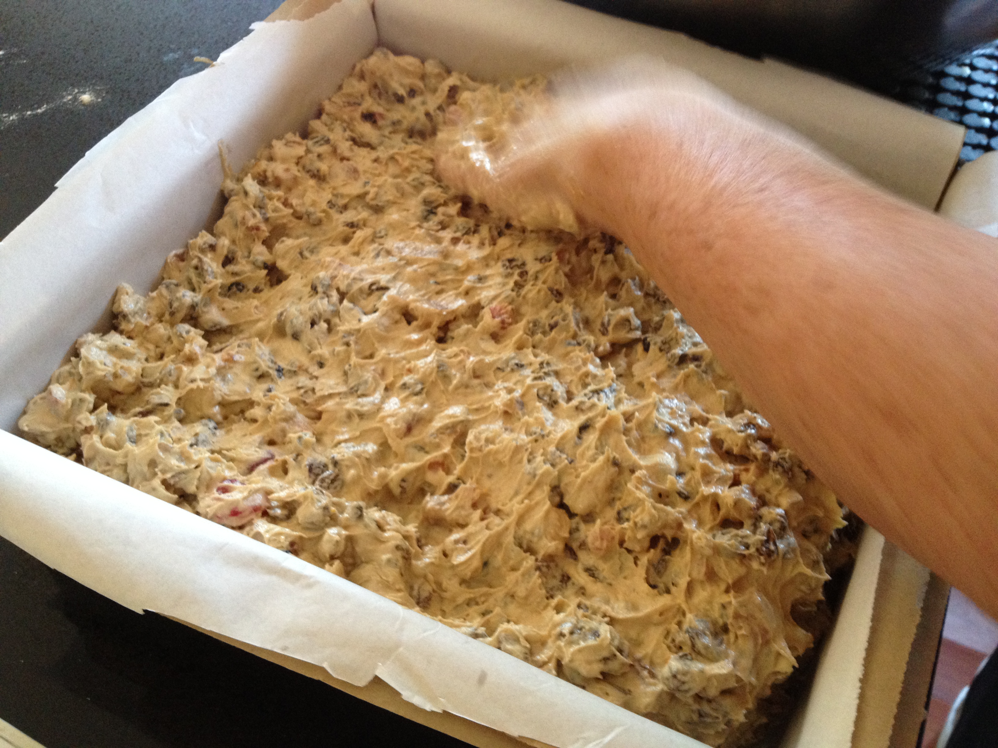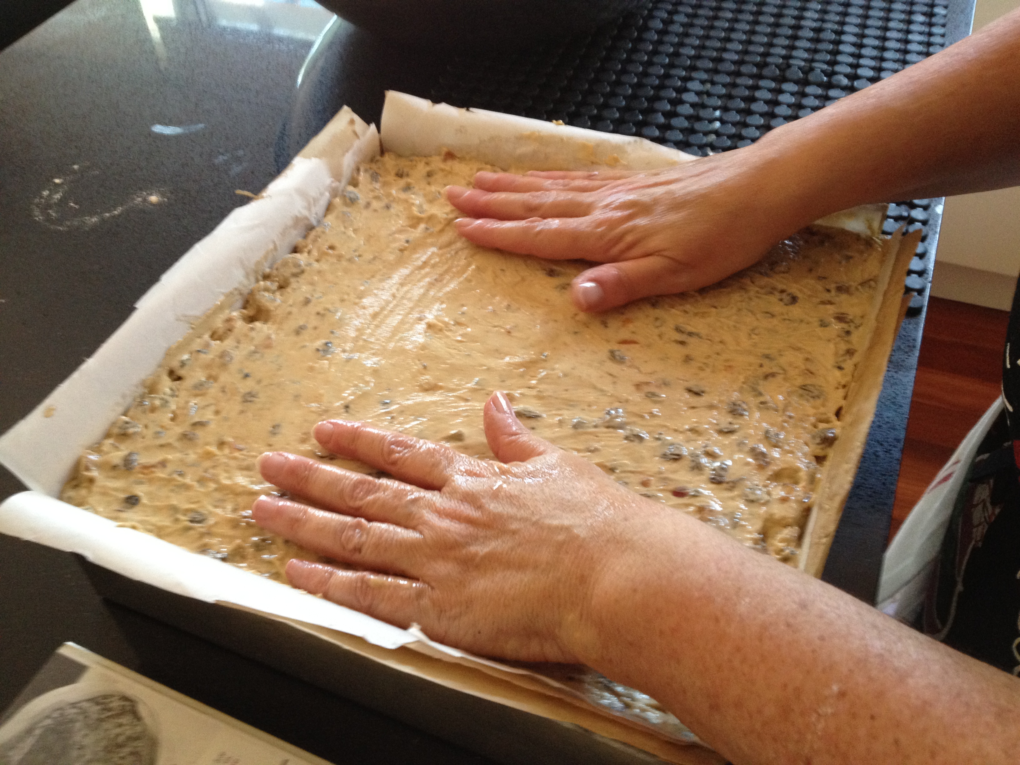 After the eggs have been mixed into the goop, add some of the alcohol soaked fruit. NOT ALL AT ONCE. Cup your hands and scoop out the first lot of fruit and put it into the goop. DON’T LICK YOUR FINGERS. You can do this after you have finished. Fold the fruit into the goop. The best and most effective method is to fold the fruit in with your hands. You will burn out any mixing engine unless it is a serious industrial cake mixer, or you will get blisters on your hands if you use a wooden spoon. In both instances they won’t be as effective.