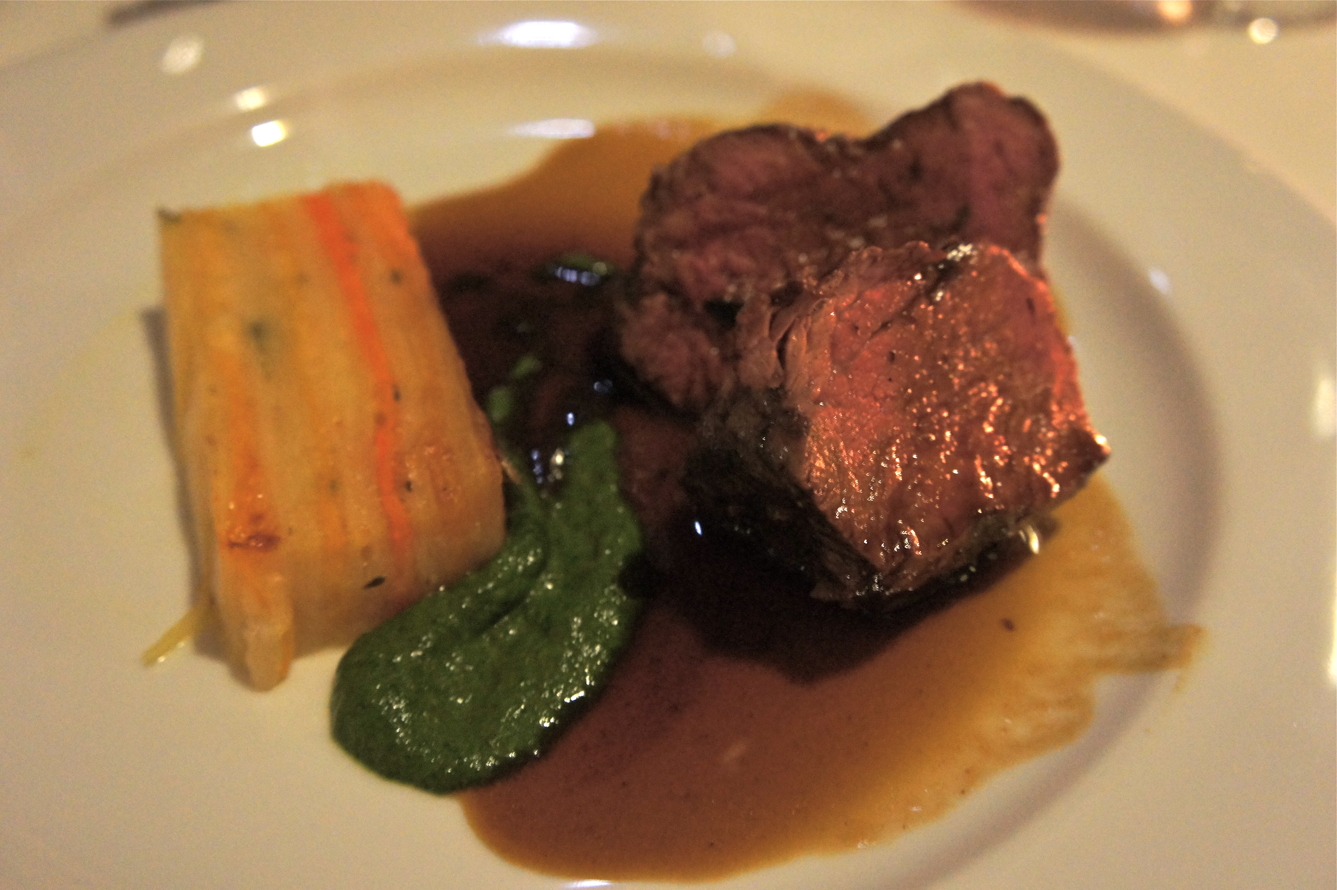 A roast dry-aged fillet of beef with root vegetable & thyme gratin, creamed spinach & red wine jus was the main course. The beef was a great piece of meat cooked to perfection, crisply seared on the outside, and red and moist on the in; the root vegetables, layers of potato and sweet potato, were to die for, and the meal was enhanced with a big, big, some said huge, red.