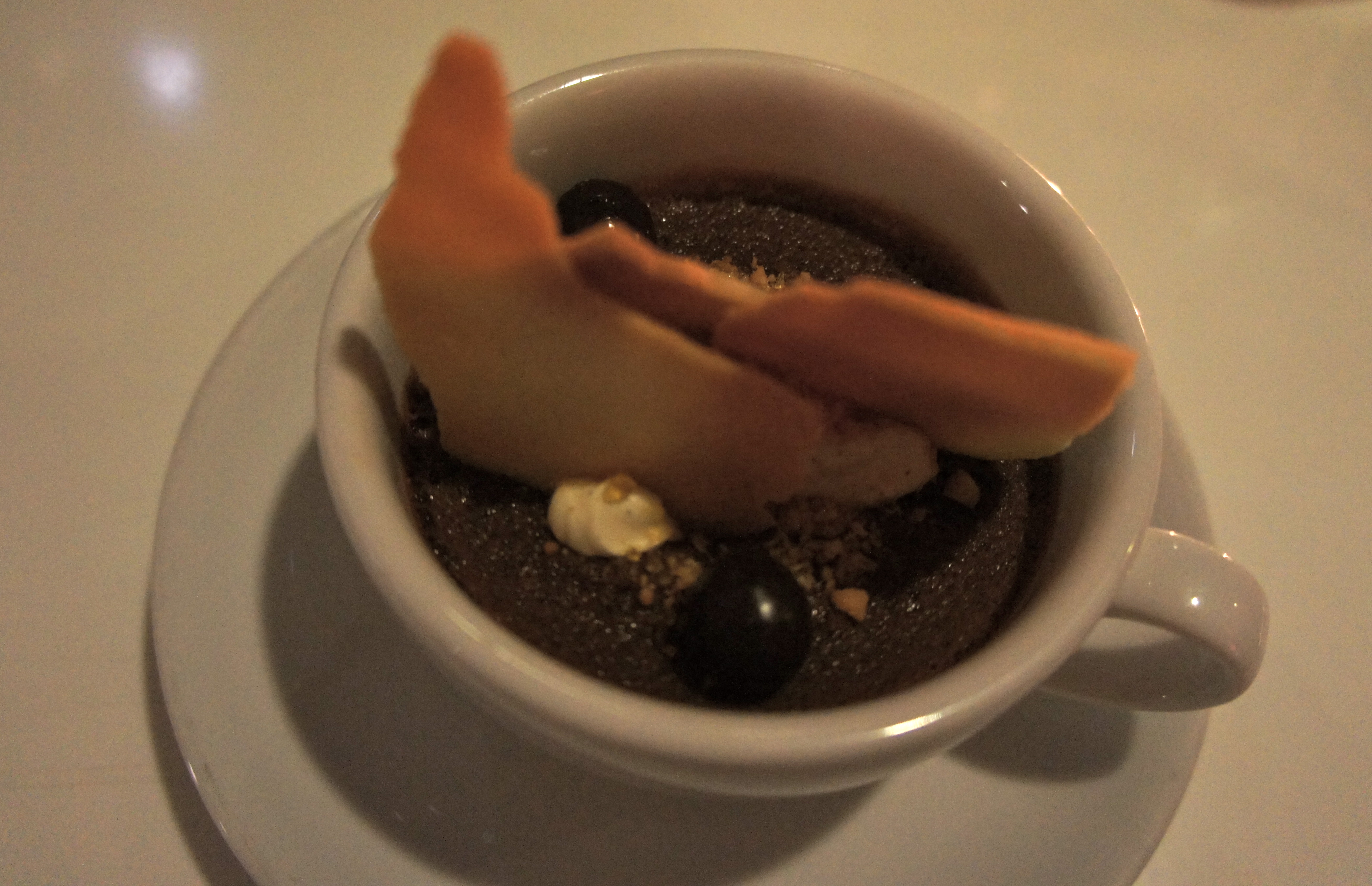 The dessert was a chocolate heaven: a French chocolate & praline pots de crème. Smooth, rich without being cloying, and a perfect end to a perfect meal. The wine as good as it was, however, did not match the dessert. His Nibs said that a glass of Tokay would have been just the ticket for this great dessert.