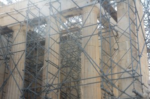 So armed with a gigalitre of water we walked to the top of the Acropolis. What I found fascinating was watching the workers involved in the restoration of the whole site. So many of the statues and other bibs and bobs still being discovered on the site have been taken down to the new museum for restoration and permanent display. Large section of the columns, plinths and mantles are being restored, replaced and cleaned in all the temples. In some instances sections of the columns are being replaced. Stone masons with skills thought long gone, chisel and sand large blocks of stone with the precision required for the finished piece to seamlessly sit in its new home, underpinning vital parts of the ancient structure.
