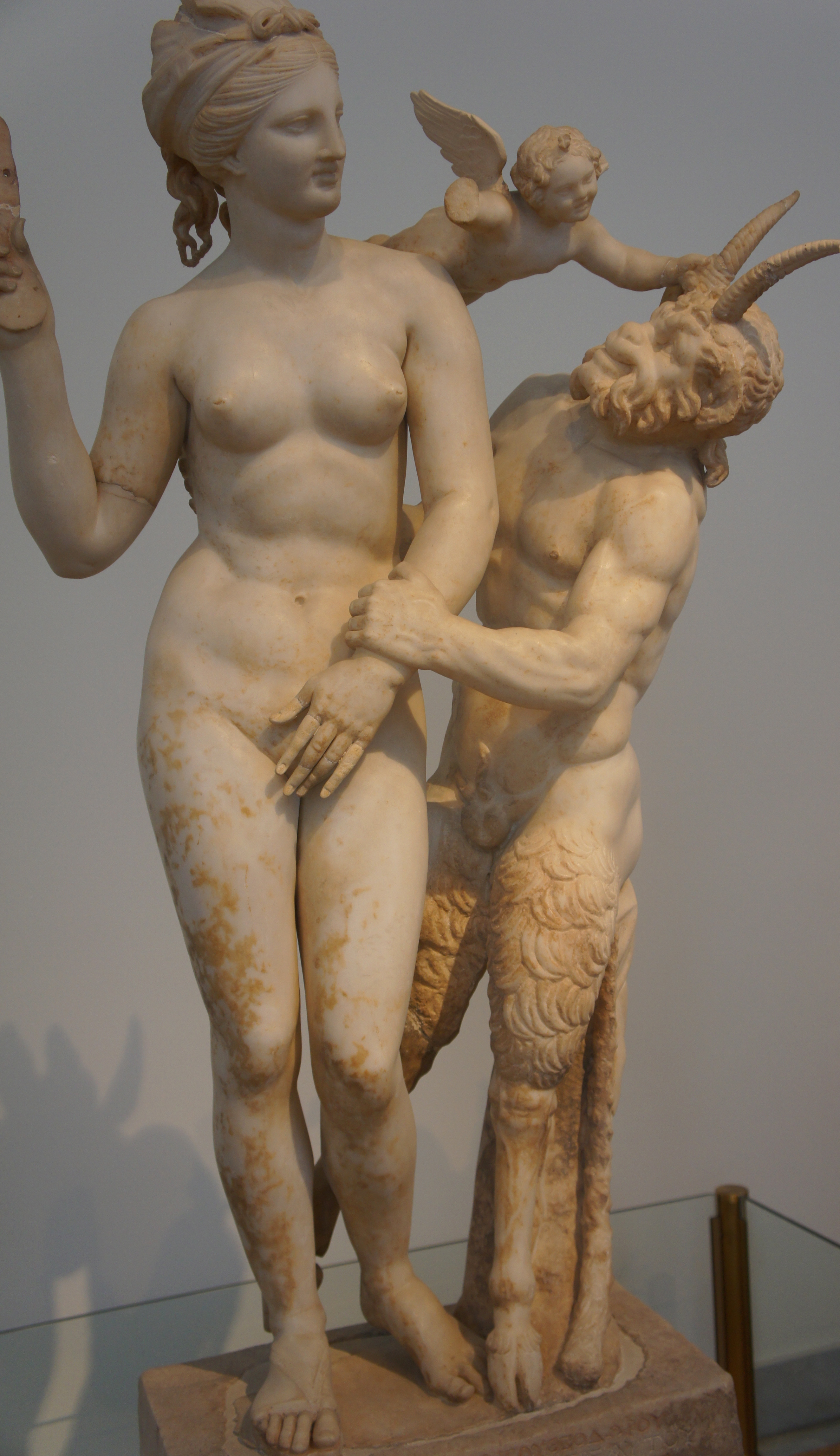 Pan is, as usual, making a pest of himself to Aphrodite with Eros helping her out. Made from Parian marble. Circa 100BC. Photo by JE who was laughing at the scene as she took the photo. Be impressed it came out at all.