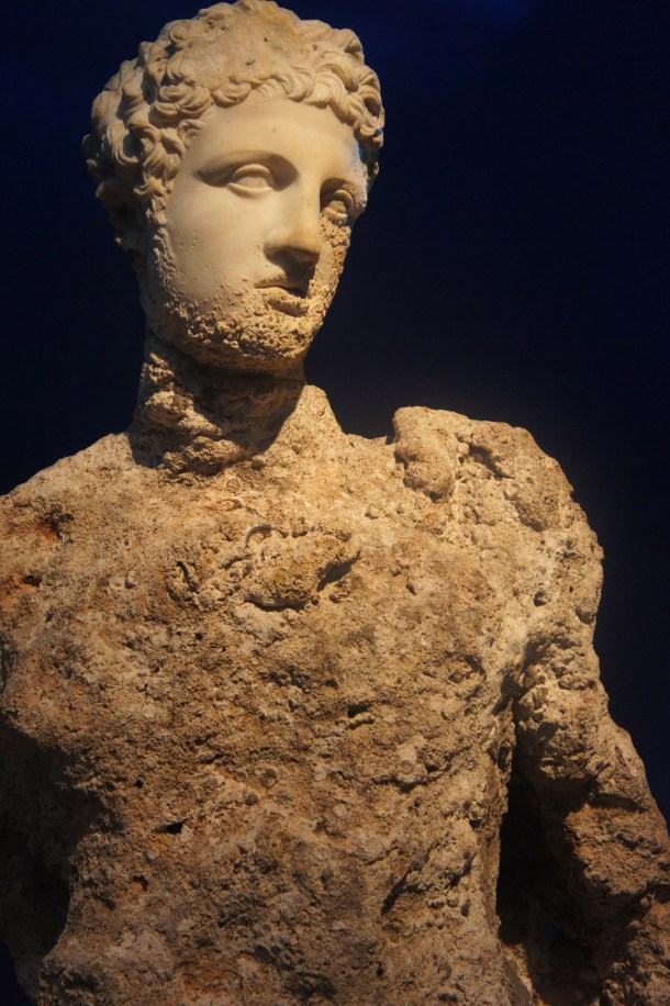 This statue of a boy is made from Parian marble and is dated in the early part of the first century BC. It is what I call one of the Jekyll and Hyde statues. The boy’s left side has been corroded by the sea organisms while the right side, buried in the sediment of the sea floor, has been preserved and is almost perfect. They are fascinating. Photo by JE.