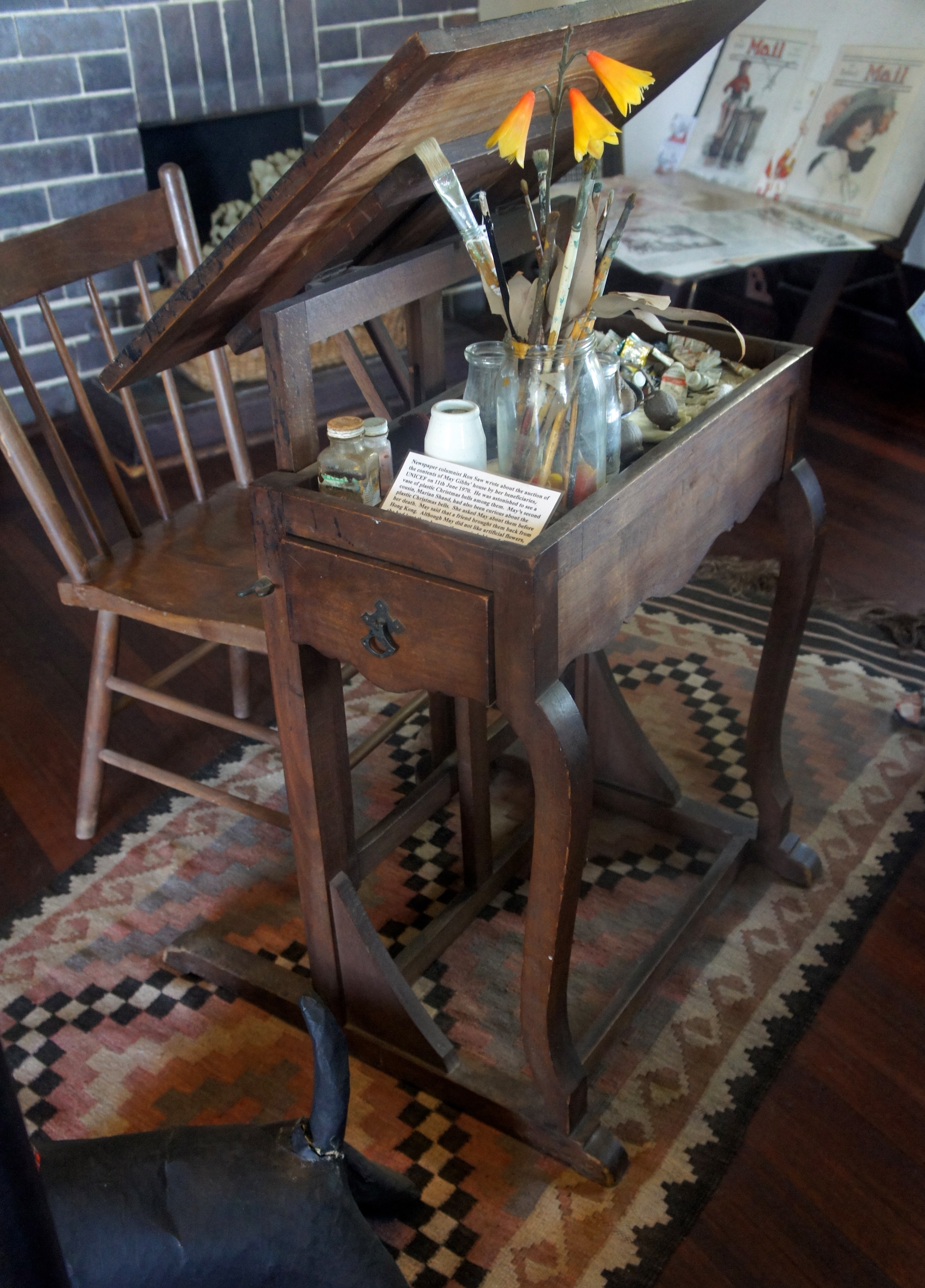 As with any Arts and Crafts house the use of wood in all things dominates the space and is gorgeous. Jarrah wood for all the floors had to be shipped in from the West Australia and, despite their age, look as fresh as a daisy. Beams, skirting boards, picture rails and fireplaces, built in cupboards, all made from cedar. A lot of the furniture on display belonged to Gibbs. Of particular interest is her work desk, and the room she chose as her studio. There is a kitchen with a Kooka stove and a sink and not much else. How they cooked huge meals in those days is a total mystery to me and the other tourists who were visiting. It became a lengthy discussion about what can be achieved in no or little space without kitchen appliances to help. My view is that men didn’t cook in those days so the kitchen was deemed unimportant. But I do remember my grandmothers’ kitchens and they were similarly tiny and inadequate.