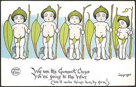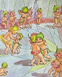 For the latter part of the Victorian era until well into the 20th century children’s stories with artwork in the Art Nouveau style, quintessentially English fairies, pixies, elves and the like were created by a host of English children’s novelists and readily available in the Australian book market. This was made easy as Australia was part of the English publishing geographical foot print, a legacy of the Imperial reign as I think we still may be, but May Gibbs was among the pioneers who created children’s fairy stories using identifiable Australian flora and fauna. Her first tale was “the Gumnut Babies’ published by Angus and Robertson in 1916.